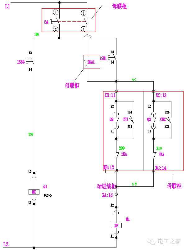 在手動操作中:10,000轉SA的1和2條腿連接在一起。當Q2和Q3閉合時,Q1閉合回路A-2和A-3斷開,其閉合線圈XF不能通電,Q1不能滿足閉合條件。同樣,當Q1、Q2或Q1、Q3同時接通時,Q2或Q3也不能滿足切換條件。使進線柜和母聯符合“三合一”的邏輯。